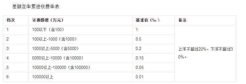 第四條 資產評估收費標準分為五檔,各檔差額計費率如下表:行計件收費的法定資產評估服務,可以按被評估資產賬面原值(無帳面原值可按評估價值或重置價值,下同)為計費額度,采取差額定率累進計算辦法收取評估費用,即按被評估資產的賬面原值的大小劃分收費檔次,分檔計算收費額、各檔相加為評估收費總額。差額定率累進收費率表